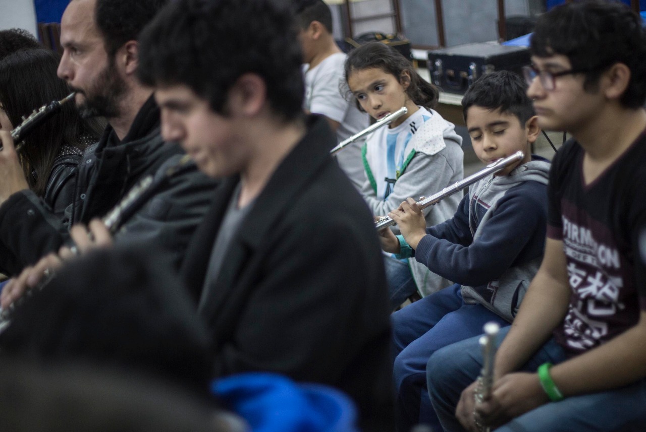 “En mi caso estudiaba violín antes y tuve que dejar porque no podía seguir pagando. Las diferencias de edades no se notan para nada, todos y todas acá tenemos que ser profesionales. Incluso cuando los profes están con alguno ocupado, entre nosotros y nosotras nos vamos enseñando”, concluye Maia Castillo Tamburro (17), flautista de la orquesta.