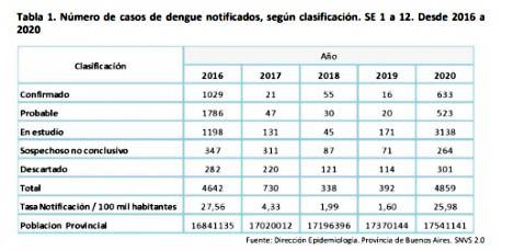En en la provincia de Buenos Aires en 2020, hasta la semana 12, fueron confirmados por laboratorio 633 casos de dengue; de ellos 517 tienen diagnóstico de laboratorio y 116 fueron confirmados por nexo epidemiológico.