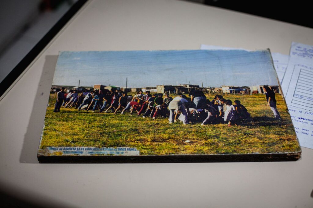 La oficina del Padre Adolfo es un cuarto pequeño entre el comedor y el templo desbordado de libros, cuadernos y recuerdos. Entre las pilas de papeles se asoman imágenes de vírgenes de distintas advocaciones, estampitas regaladas, fotos viejas y souvenirs de bautismos y peregrinaciones. La capilla, nos cuenta Adolfo, hace poco dejó de ser capillita para convertirse en parroquia, y esa transformación también se nota en estas paredes, donde la memoria del barrio se apila como un archivo vivo.