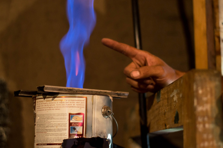 El biodigestor de Carlos es un tanque de agua plástico cortado y adentro tiene uno más pequeño que se llama “campana”. Ahí hay ausencia de oxigeno y es donde se acumula el gas que despide este proceso. Cuando esto sucede se empieza a levantar por la presión por lo que el hombre le pone una piedra arriba y aprovecha para regular la potencia con la que quiere que salga el gas que va por un caño plástico de riego a la casa de barro, donde tiene una cocina hecha con una lata de pintura de cinco litros.
