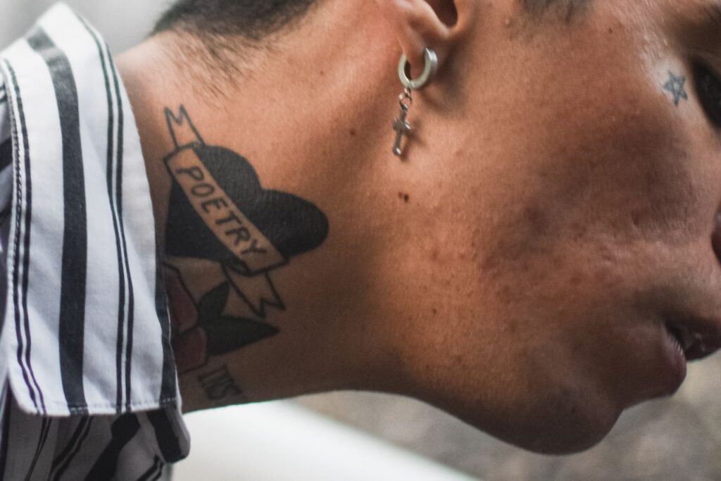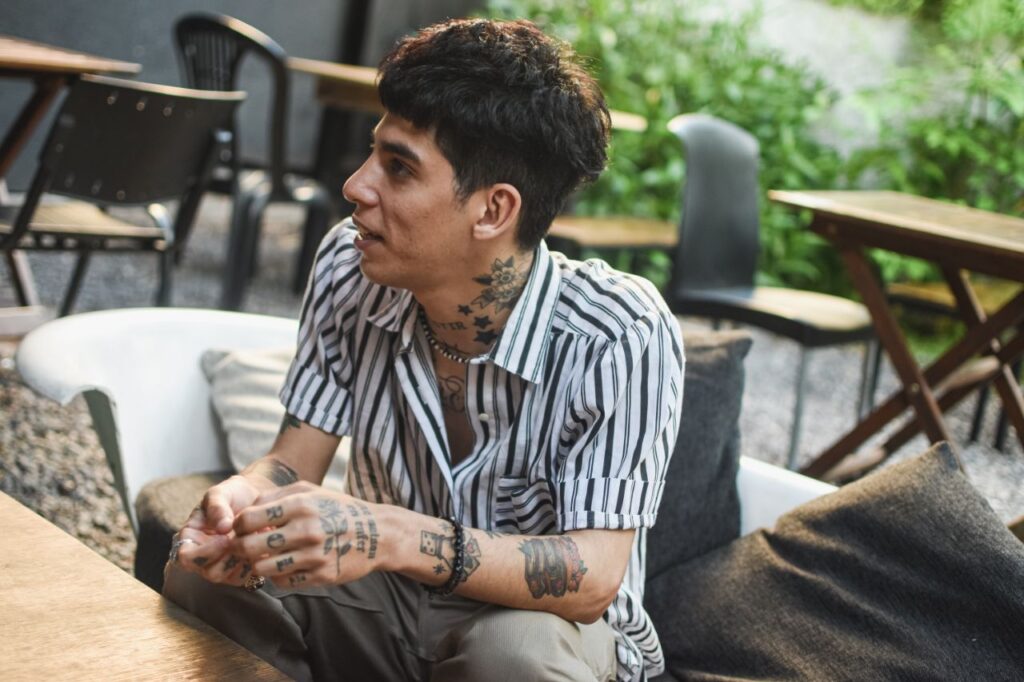 Tatuajes de cartas, dados, flores y libros llenan los brazos de Enzo, algunos pequeños otros más grandes: “A mi cuando me baja una idea me baja entera: ya se como la quiero vender, como la quiero mostrar, cual es la estética, la letra, cual va a ser la melodía, eso me hace difícil a veces trabajar con una banda”.
