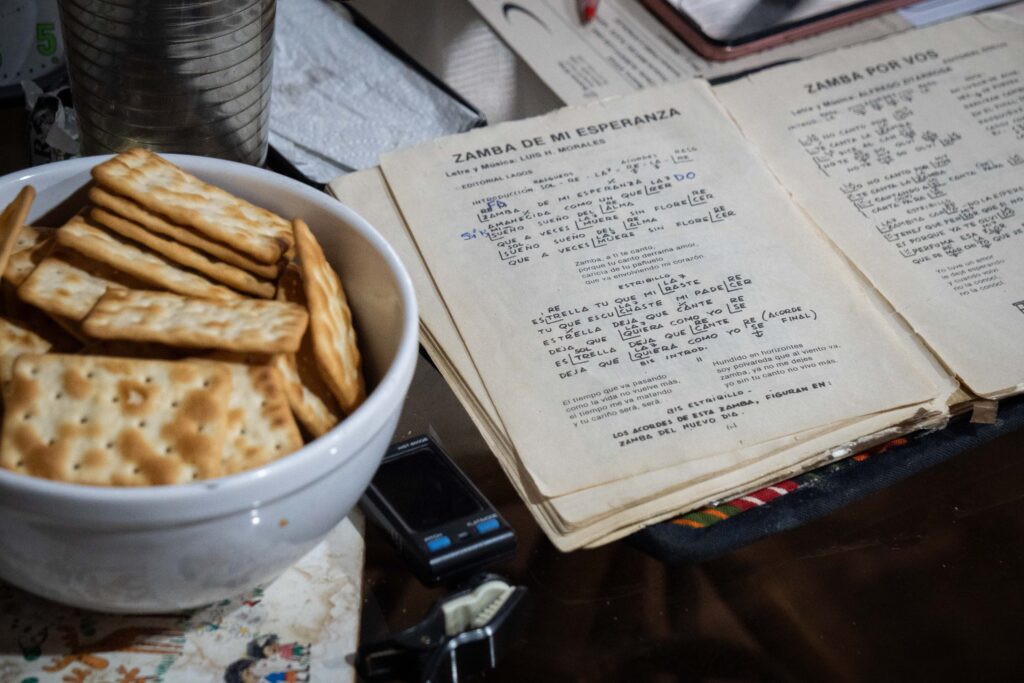 Cuando llegamos, sobre la mesa estaban las partituras de “Zamba de mi esperanza” y su guitarra. Estaba preparando canciones para la raviolada que tiene el domingo con compañeros, con los que luego de comer cantan. Ceba mate y ofrece galletitas de agua.