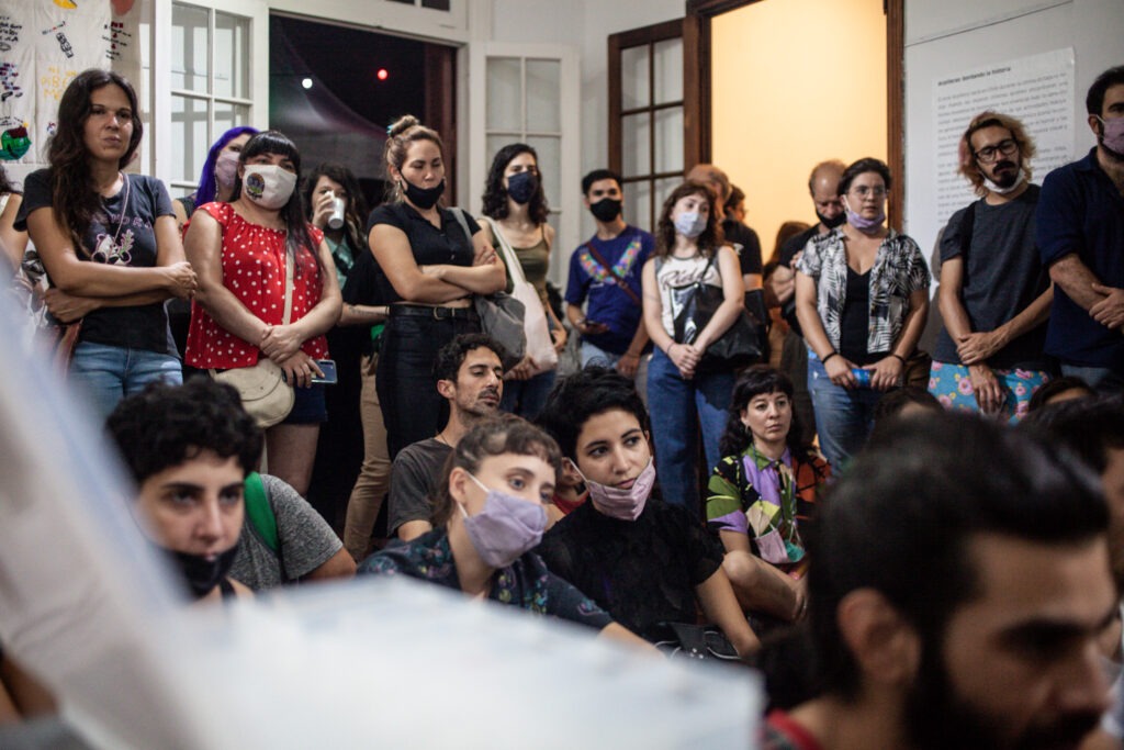 Pero la exposición no termina ahí. En el subsuelo se encuentra la instalación “La Quema: No estamos todxs”, de la Cooperativa Bella Flor y Alicia Duarte. La historia de los barrios del humedal de la Cuenca Reconquista se sumerge con la historia de Diego Duarte, porque todavía falta. Y al costado de ella, en un cuarto oscuro iluminado por pequeñas luces nos adentramos al mundo del penal: ‘CUSAM: la palabra es libertad’. Las frazadas desplegadas sobre las paredes nos cuentan la historia de las mujeres privadas de su libertad, los libros escritos en los talleres de escritura nos hablan de su vida y un altar nos cuenta lo que falta.