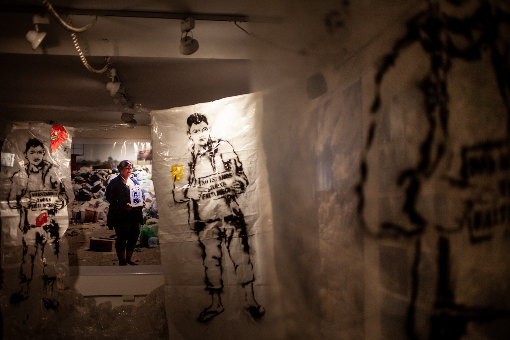 Pero la exposición no termina ahí. En el subsuelo se encuentra la instalación “La Quema: No estamos todxs”, de la Cooperativa Bella Flor y Alicia Duarte. La historia de los barrios del humedal de la Cuenca Reconquista se sumerge con la historia de Diego Duarte, porque todavía falta. Y al costado de ella, en un cuarto oscuro iluminado por pequeñas luces nos adentramos al mundo del penal: ‘CUSAM: la palabra es libertad’. Las frazadas desplegadas sobre las paredes nos cuentan la historia de las mujeres privadas de su libertad, los libros escritos en los talleres de escritura nos hablan de su vida y un altar nos cuenta lo que falta.