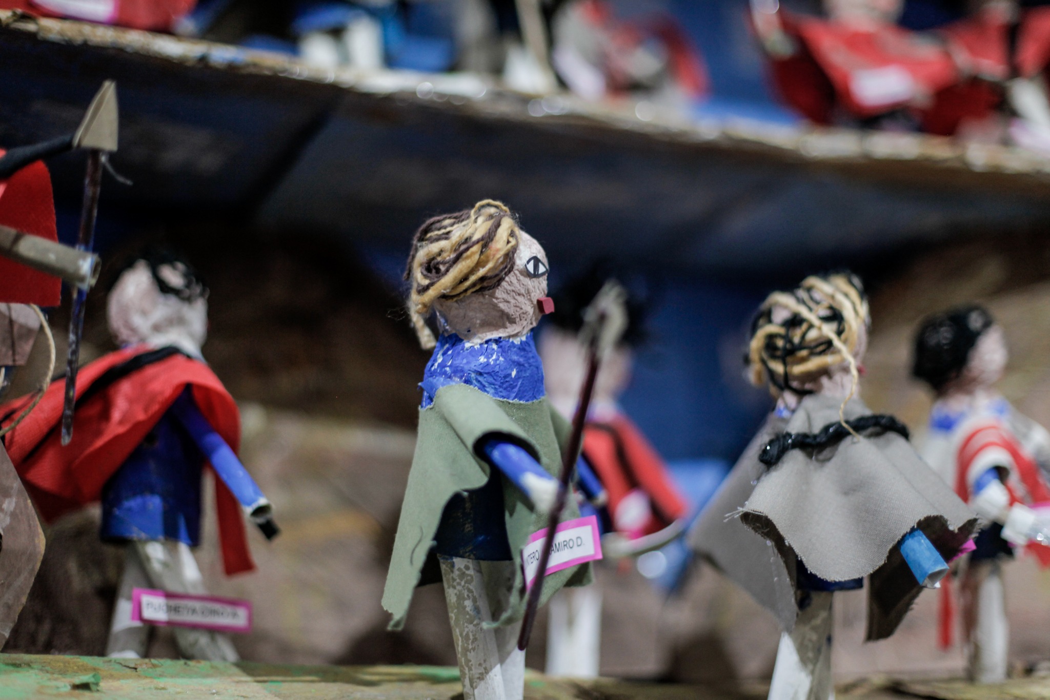 Contra la pared del fondo se despliega el arte de los jardines maternales y de infantes ‘La Colmenita’. Las maquetas, ‘Gesta independentista latinoamericana’, de los y las niñas despliegan historia, pueblos originarios y actores sociales. Más adelante estas maquetas serán acompañadas por un gran mural también realizado en el jardín.