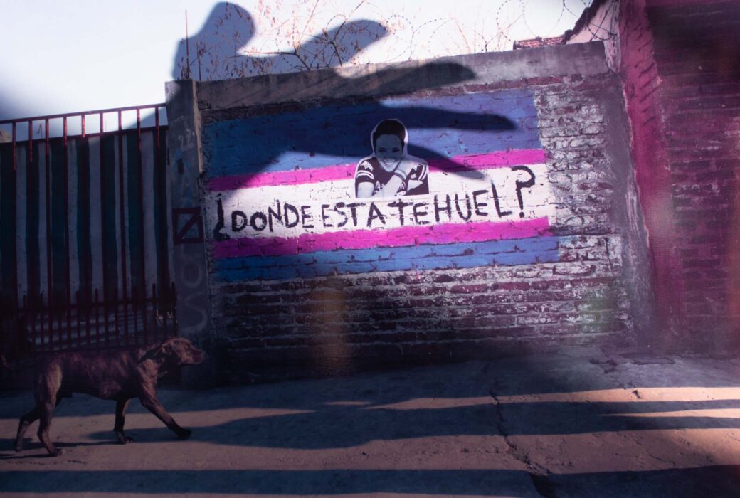 La sombra de una mano atraviesa la fotografía del Mural Realizado en Villa Carcova, tras la búsqueda de Tehuel De La Torre un chico trans de 22 años, que fue visto por última vez el 11 de marzo cuando se dirigía a una entrevista laboral en Alejandro Korn, desde su casa en San Vicente. La fotografía pertenece a una muestra “Cupo laboral Travesti- Trans” expuesta en la inauguración del Espacio de Juventudes y Diversidades en San Martin, Argentina el 24 de septiembre de 2021. Foto/ Luz Mala