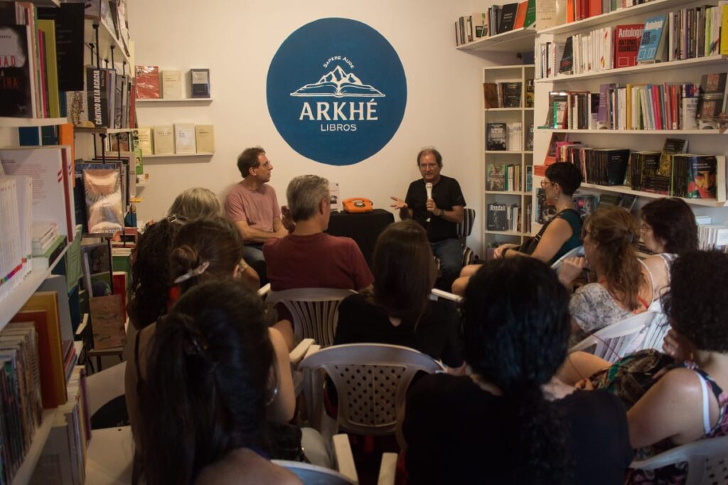 La reflexión invita, es sábado, son las seis de la tarde, empieza a aflojar el calor, y Kohan llega a Villa Maipú en bicicleta para conversar sobre este libro nuevo que dialoga con tantos otros que ya escribió: 7 libros de ensayo, 3 de cuentos y 10 novelas, como dicen las últimas dos contratapas, hasta el momento. El portón de la librería de garaje se abre hacia arriba, las sillas acomodadas en hileras copan la vereda y esperan el comienzo de esta conversación en el showroom de Arkhé, una librería que es comunidad de lecturas, necesidad que afloró en la pandemia de dos lectores voraces: Estefi y Rodrigo, anfitriones.