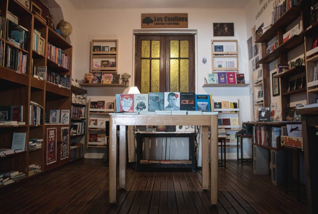 Dentro de La Bemba, “Los Confines” tiene su espacio en el patio de atrás, la librería está en un cuarto con pisos de madera y una frase de Liliana Bodoc en la pared. Estantes de libros a los costados y una mesa con novedades frente al escritorio principal. Los Confines trabaja, sobre todo, con editoriales independientes.