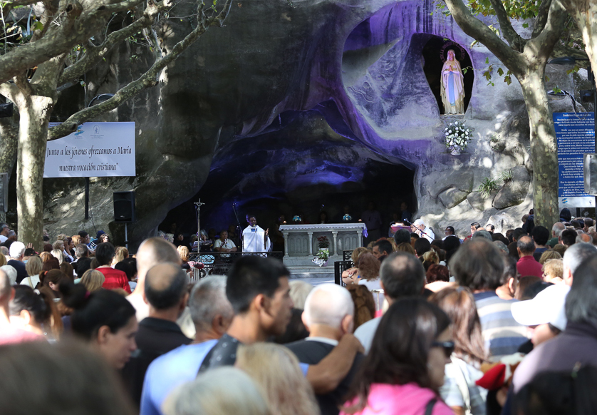 En un ambiente familiar y de gran tranquilidad aunque en constante movimiento, se realizó, a las siete de la tarde, la solemne concelebración en honor de la Patrona de la diócesis presidida por el obispo de San Martín monseñor Guillermo Rodríguez-Melgarejo con la presencia de los intendentes de los partidos de San Martín y Tres de Febrero, que conforman el territorio diocesano. En el templo los peregrinos escucharon con atención la liturgia, y podía verse a varias generaciones unidas por la devoción a la “virgencita” de Lourdes. En sintonía con el lema de la fiesta “Junto a los jóvenes ofrezcamos a María nuestra vocación cristiana” se vio a varios niños junto con abuelos cumpliendo con el rito de llevarle la velita encendida hacia el costado izquierdo de la gruta al aire libre destinado para eso, familias enteras haciendo la cola para llenar sus botellitas o bidones con el “agua bendita” de las canillas en la parte lateral del templo inferior. También había jóvenes del barrio y los alrededores como Noelia y Javier que se acercaban: “a ver qué onda, como hay tanta gente hoy en el barrio… y si, a la virgencita también”.