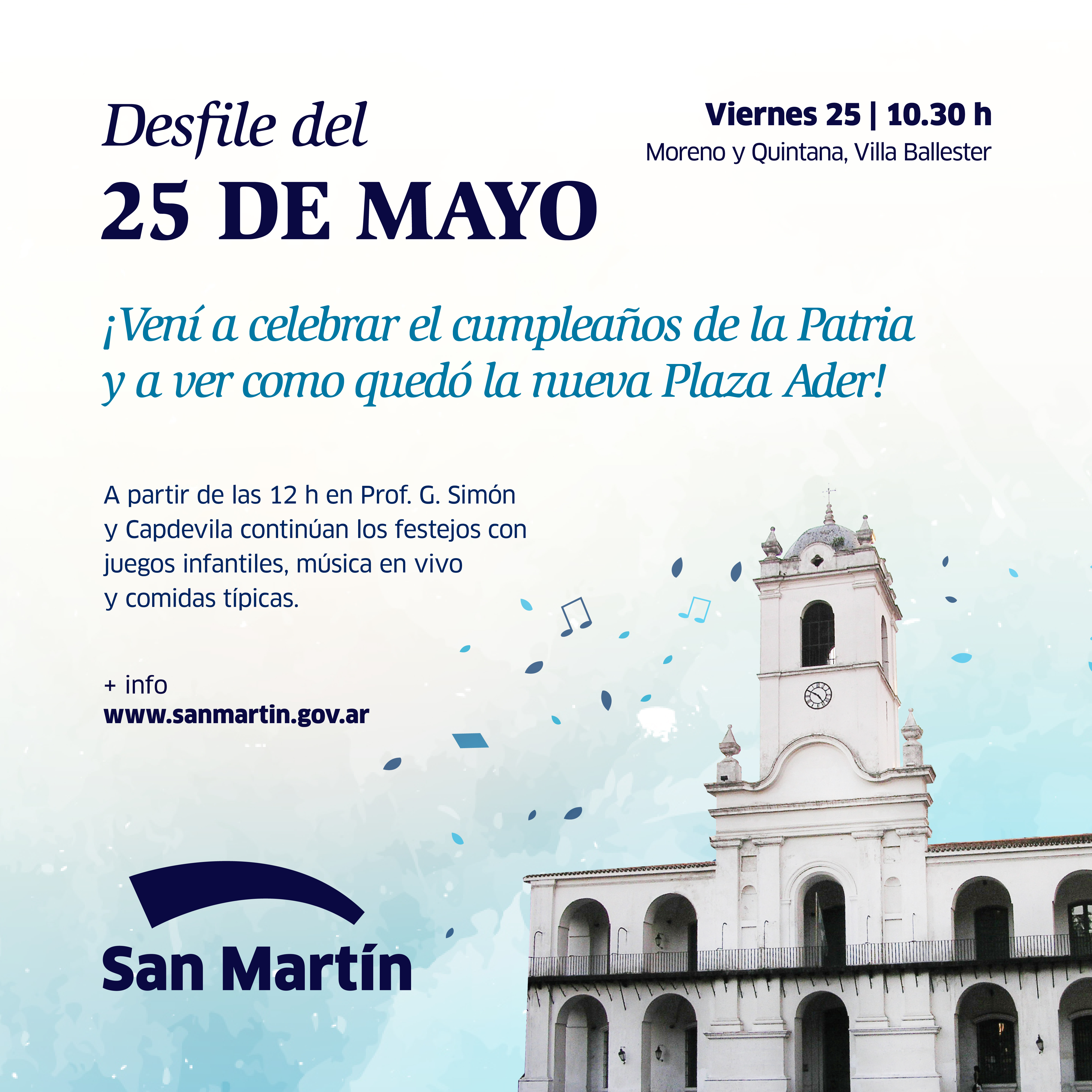 Los festejos por el aniversario de la Primera Junta de gobierno patrio se celebrará en la localidad de Villa Ballester: El tradicional desfile será en Moreno y Quintana. Luego, las actividades continuaran en la renovada Plaza Ader, con espectáculos, música en vivo y feria gastronómica.