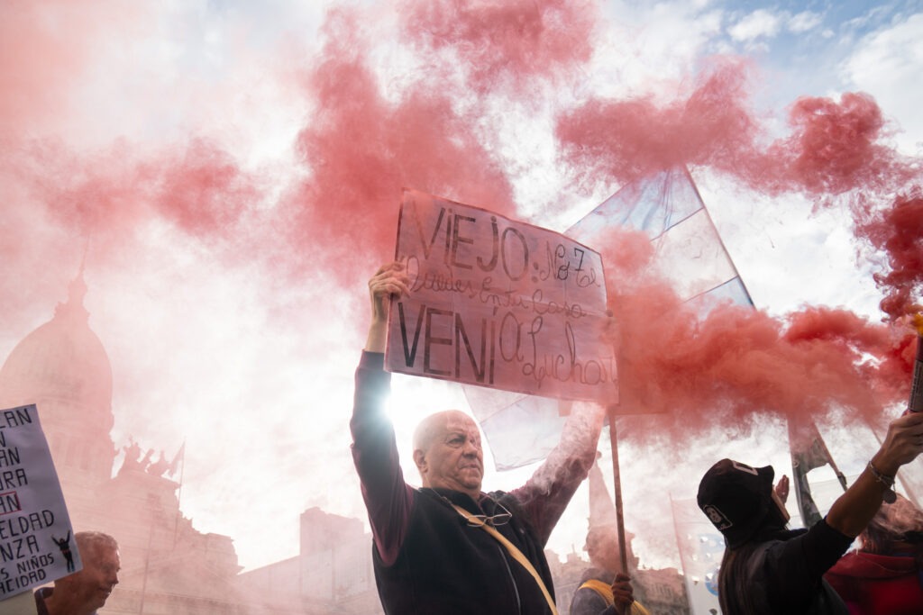 El gas corre intensamente y a veces el viento sopla contra los jubilados. En respuesta hay vómitos, lágrimas, gritos exigiendo mesura a la policía. Los ojos queman, la garganta arde. En el cielo sobrevuelan más drones que palomas y en el suelo la represión crece y crece de manera brutal. Un efectivo policial golpea con la macana a una señora. La mujer cae y da la cabeza contra el asfalto.