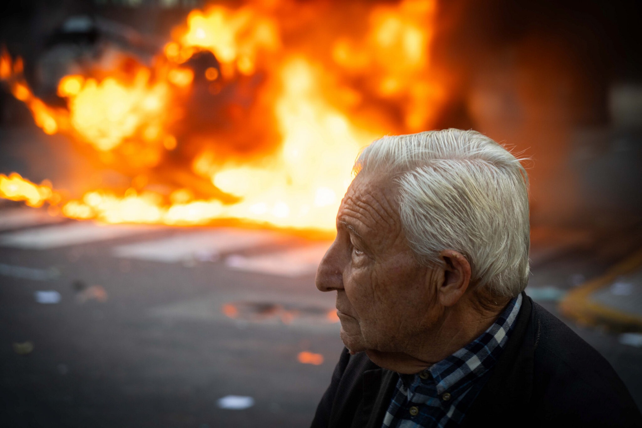 El gas corre intensamente y a veces el viento sopla contra los jubilados. En respuesta hay vómitos, lágrimas, gritos exigiendo mesura a la policía. Los ojos queman, la garganta arde. En el cielo sobrevuelan más drones que palomas y en el suelo la represión crece y crece de manera brutal. Un efectivo policial golpea con la macana a una señora. La mujer cae y da la cabeza contra el asfalto.