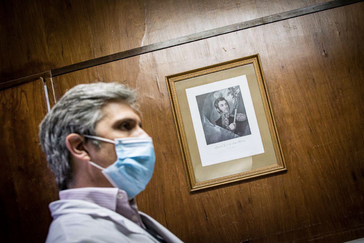 El barbijo de Alejandro apenas permite ver sus ojos marrones, chiquitos por el cansancio. Agachamos la cabeza para saludarnos, buscando modos de transmitir algo. Hace mucho frío. Hay una estufa encendida y la ventana está un poco abierta. El único inmutable en esa habitación es San Martín, que nos mira sin barbijo desde una de las paredes. Suena su celular. Pide disculpas y atiende. Tranquiliza a la persona que está del otro lado del teléfono y promete resolver cuanto antes su situación. Finalmente, nos sentamos.