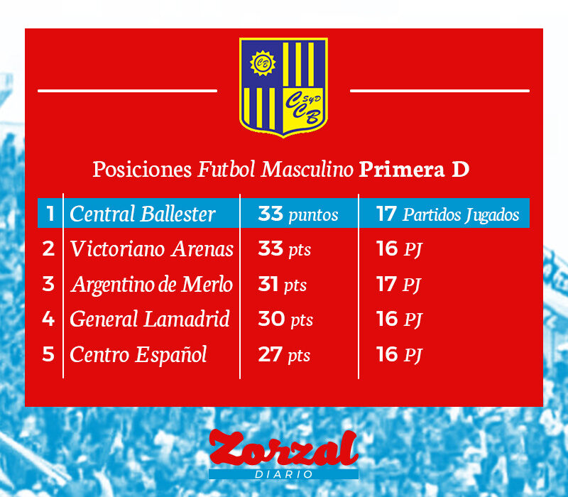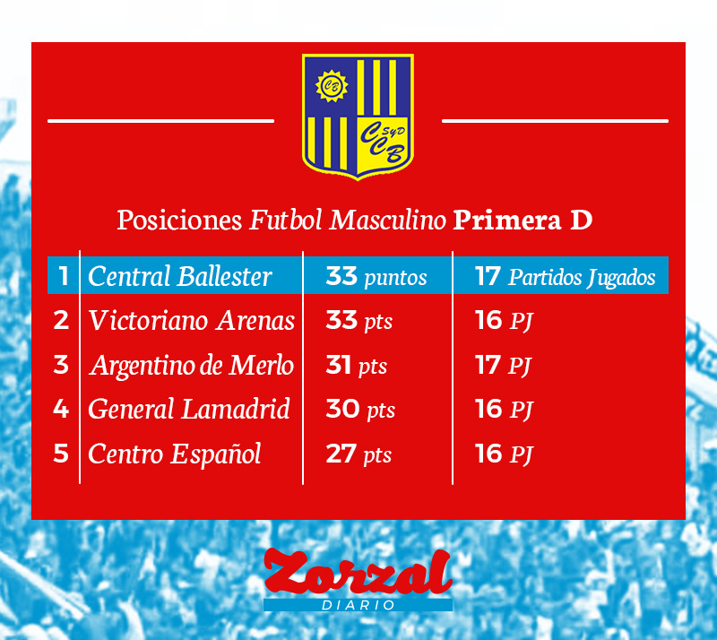Central Ballester empató 1 a 1 contra Muniz en condición de visitante y escaló a la primera posición de la Primera D por diferencia de gol. Los dirigidos por Miguel Hernández van invictos en lo que va del año consiguiendo cuatro puntos sobre seis jugados. En la próxima jornada jugará de local ante Argentino de Merlo, mientras que el ahora escolta Victoriano Arenas se enfrentará a Centro Español el martes por la tarde para mantener su liderazgo en la categoría.