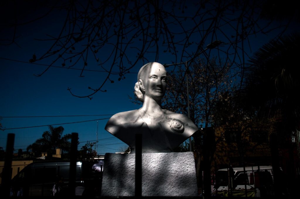 Si alguien se coloca en el lugar donde el atacante vendía algodones de azúcar, lo primero que ve es un retrato de Eva Perón sobre unas gradas que dan a los juegos para chicos. Si gira a la derecha, el mural de Néstor Kirchner ordenando bajar el cuadro del genocida, Jorge Rafael Videla. A la izquierda, pintadas con sus pañuelos, las abuelas de Plaza de Mayo. Si mira al suelo, hay pañuelos blancos anudados. Si levanta la cabeza, el mástil de la plaza. En su base, escritos en fila, hay dieciséis nombres: todos desaparecidos durante la última dictadura militar.