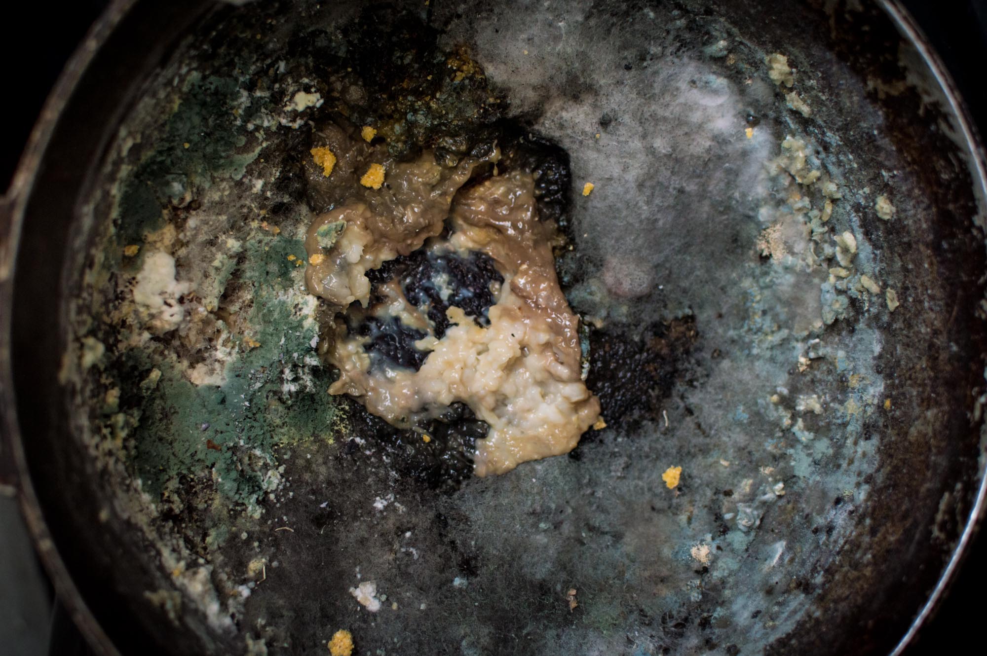 Hay una faja judicial partida en la puerta de entrada del monoambiente, cuatro tomos de la colección «Un paseo por el cosmos» sobre una mesa, una olla con arroz verde y grumoso, papeles revueltos entre montículos de prendas sobre el piso. Hay una alacena inclinada y empotrada a la pared, un plato verde con comida para gato, una cama despojada. Hay una lámina de radiografía de pulmones suelta, un espejo sucio que fragmenta todo lo anterior.