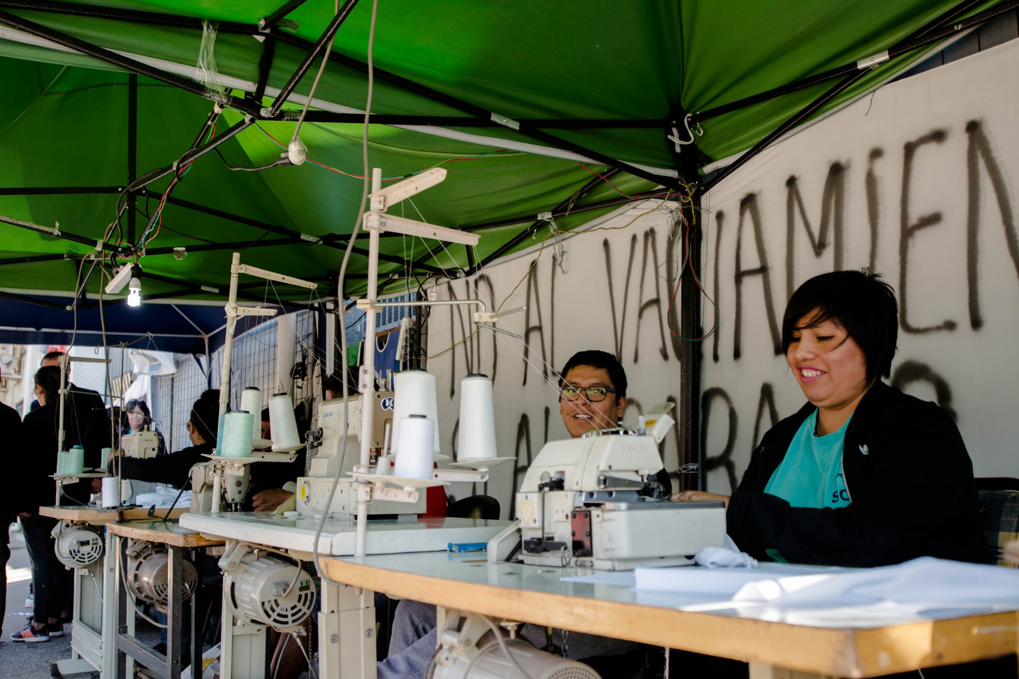 Trabajando en las veredas y mostrando el paso a paso su trabajo, lxs trabajadorxs de Spor Tech salieron con las máquinas a la calle como respuesta política a la situación de trabajo en la que viven desde que cerró la fabrica textil proveedora de Adidas, Nike y Puma.