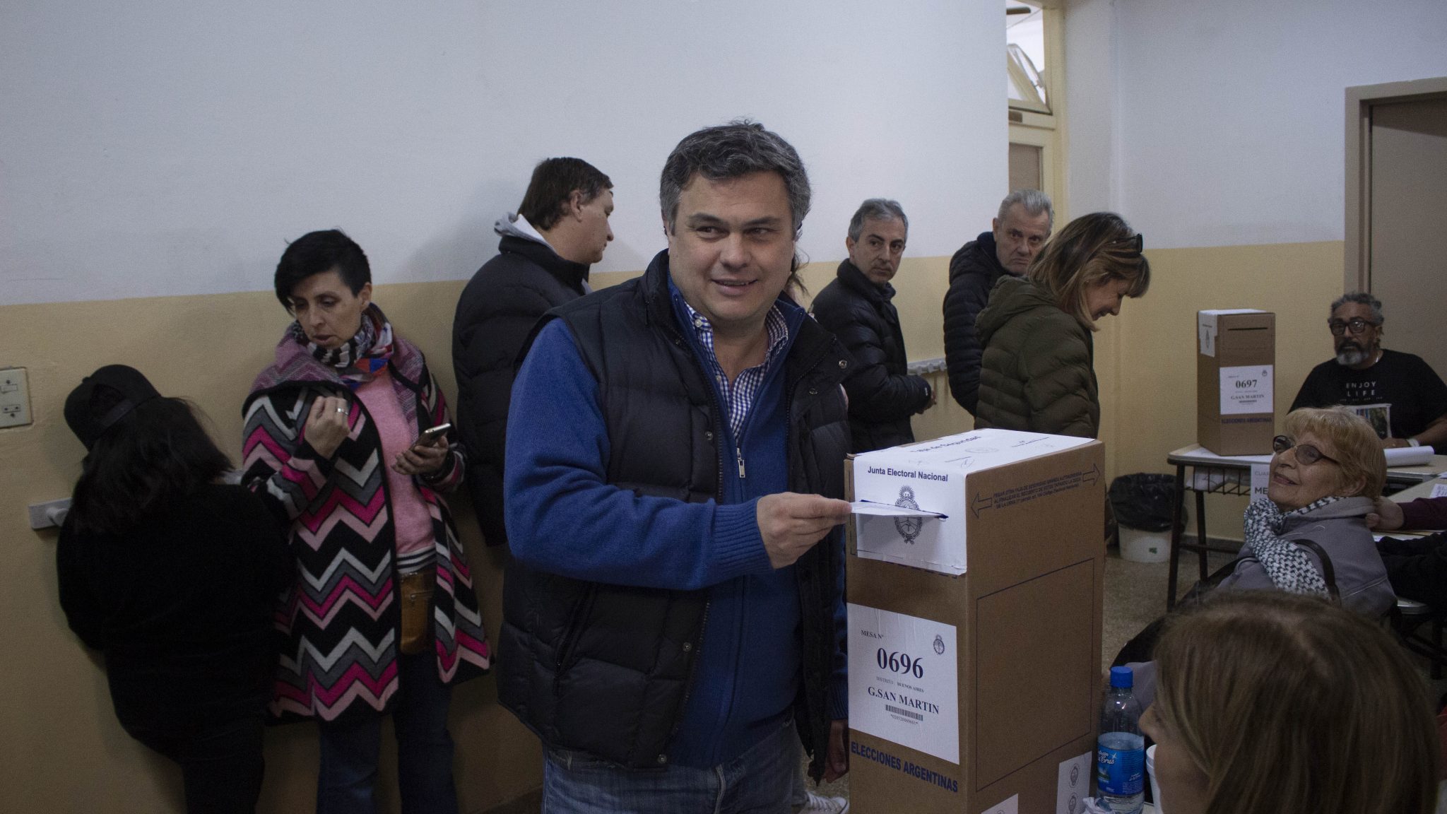 El precandidato a intendente de Juntos por el Cambio, Santiago López Medrano, emitió su voto en la escuela número 34 ubicada en Malaver. Llegó acompañado por sus asesores minutos antes de las 11 horas.